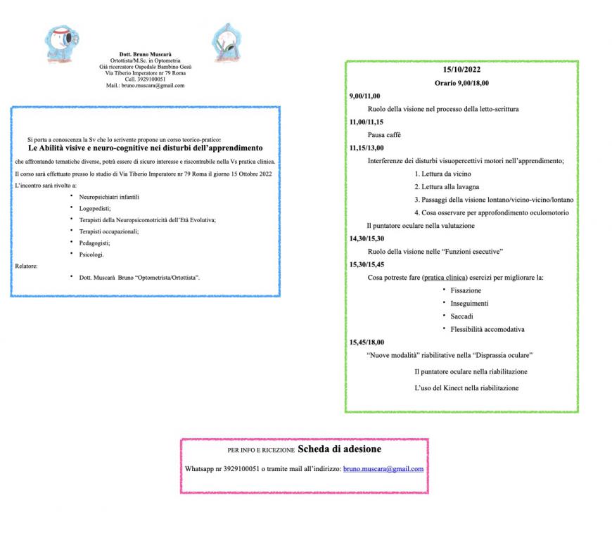 il dott. Bruno Muscarà propone un corso di formazione che pone una linea di contatto tra il mondo dell'ortottica e quello dei sidordini del neurosviluppo, verso una sempre maggiore integrazione
