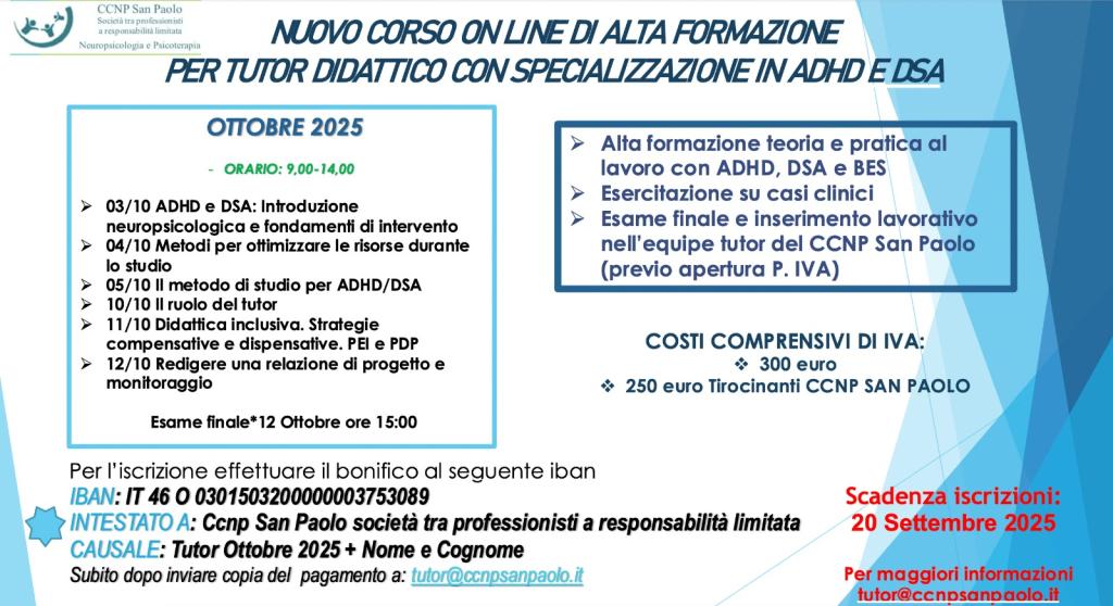 Si prepara la nuova edizione del Corso Tutor. L'obiettivo è formare degli specialisti per l'assistenza allo studio domiciliare di studenti con ADHD/DSA. Le lezioni proposte dal CCNP sono interattive e mirano a dare basi teorico pratiche che rendano il fruitore in grado di essere operativo già alla fine del corso. A tal fine il CCNP offre la possibilità di collaborare come operatori del centro e garantisce ai propri collaboratori supervisioni gratuite e consulenze di supporto in un lavoro d'equipe con tutti gli specilisti che seguono lo studente e con la scuola. La nostra mission è diffondere e supportare sempre le buone prassi.